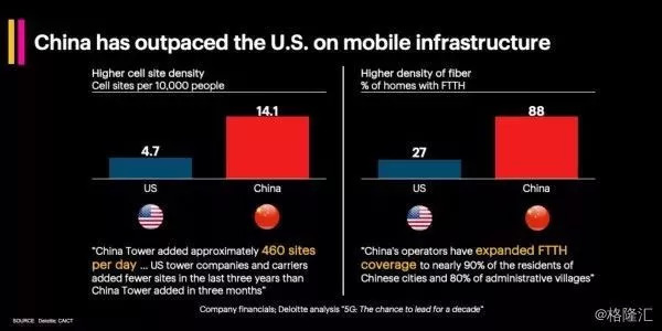 在基础设施方面,中国铁塔拥有的站址规模超过190万个,而美国所有移动运营商和铁塔公司拥有的站址全加起来都不过20万个;过去三年以来,中国铁塔新建了超过35万座铁塔,而美国则不到3万个;中国每10000人拥有的铁塔数量为14.1个,而美国仅为4.7;中国FTTH(一种光纤通信传输方法,能直接把光纤接到用户所在地)的覆盖率为88%,而美国仅为27%。