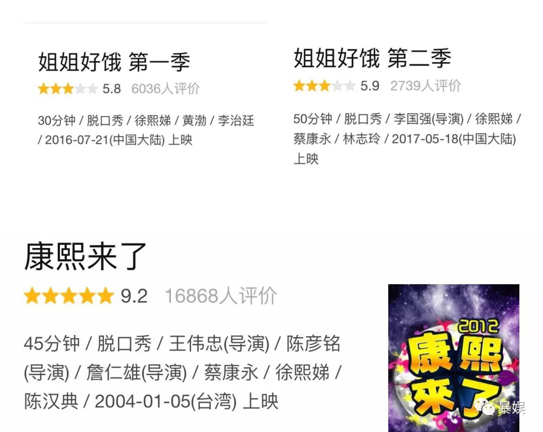就拿《姐姐好饿》来说,相比曾创造12年收视辉煌、豆瓣9.2高分的《康熙来了》,《姐姐好饿》一二季豆瓣评分竟连及格线都没达到,如此大的落差想必连小S自己都没想到吧,小S在综艺《姐姐好饿》里尴尬的谈话遭到广大网友吐槽。