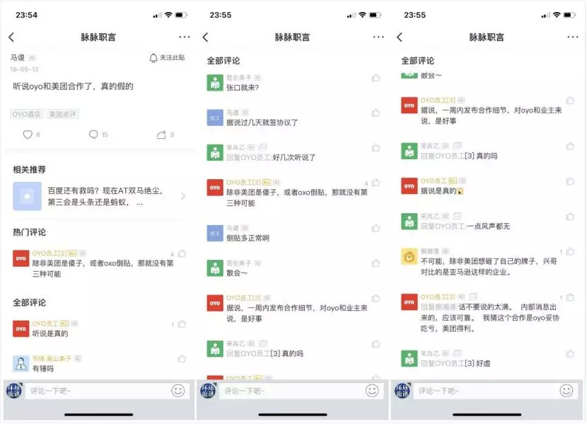 事实上,5月13日,就有名为“马谡”的网友在脉脉上爆料OYO和美团合作的消息,评论区有自称OYO的员工称“听说是真的”,“据说,一周内发布合作细节,对OYO和业务来说,是好事”。