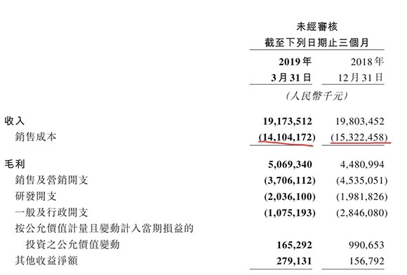虽然Q1是广告、外卖行业的淡季,加上大环境的影响,我们可以看到美团采取了和网易类似的策略,通过削减成本提高利润。观察美团的利润表,本季度,美团点评在销售成本投入为141.04亿,去年同期为80.63亿,但相比2018年Q4的153.2亿成本减少投入近12个亿。