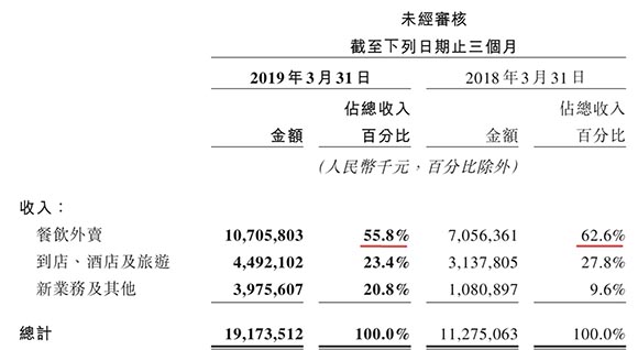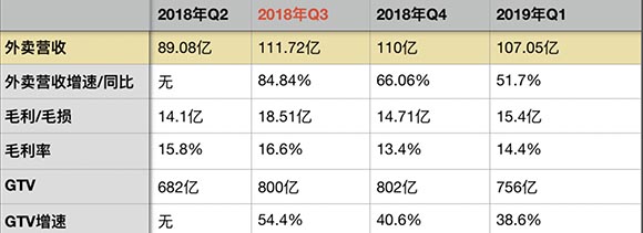 餐饮外卖收入从上季度的110.06亿元下降到本季度的107.05亿元,环比跌2.7%。在此之前,2018Q4餐饮外卖收入已较2018Q3减少1.7亿元。