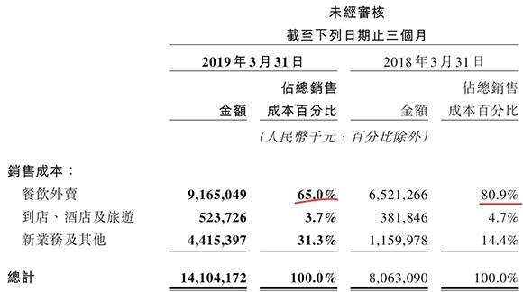从分项销售成本上看,美团外卖靠65%的销售成本,贡献了55.8%的营收;远好于去年同期要依赖80%以上的成本才能达到60%的营收。
