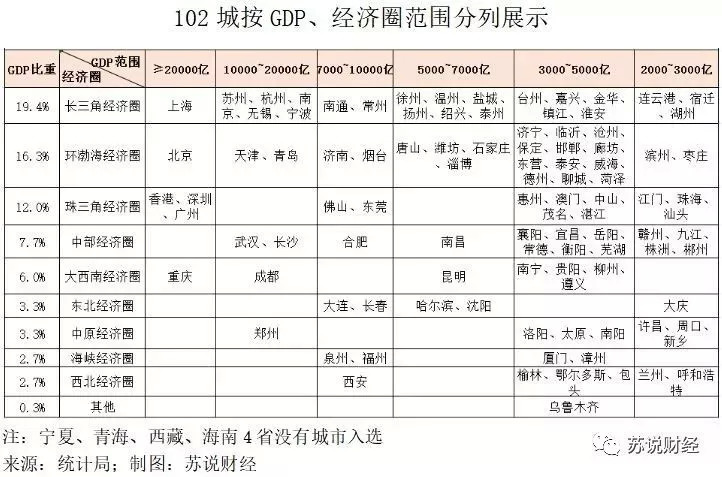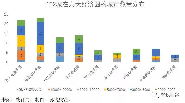 我们将102个城市按照GDP规模的不同层级进行分类统计,然后分别归属到九大经济圈内,并制作了如下这张表,以试图分析不同经济圈的经济实力差距。