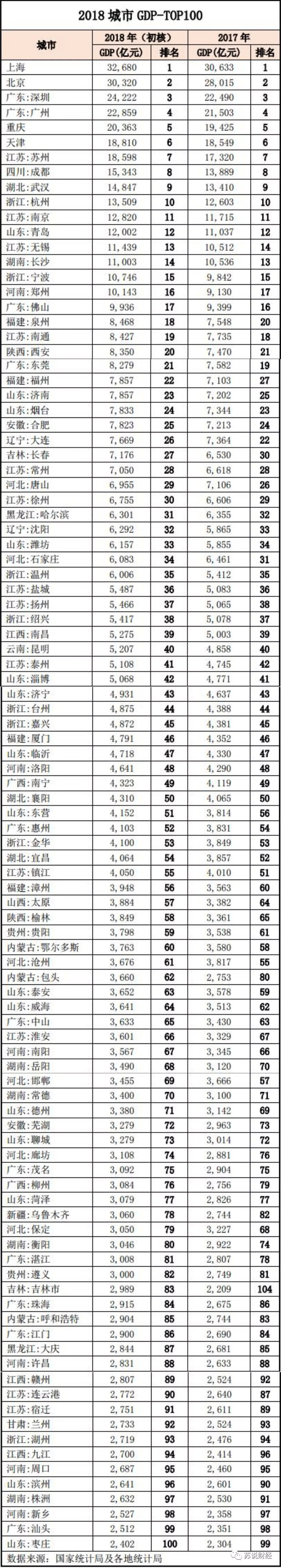就2018年和2017年的城市GDP-TOP100对比,可以简单总结几点: