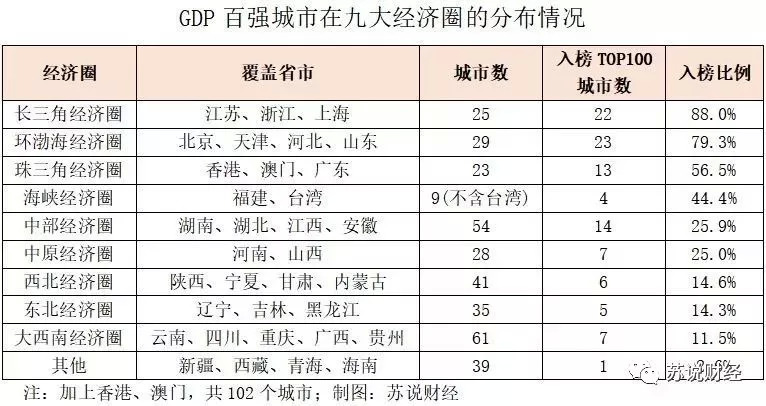 “乱花渐欲迷人眼”。本着严谨、可操作的态度,小编参考了经济圈的划分标准,做了部分调整,将全国划分为九大经济圈,并进一步考察GDP百强城市在九大经济圈的分布。