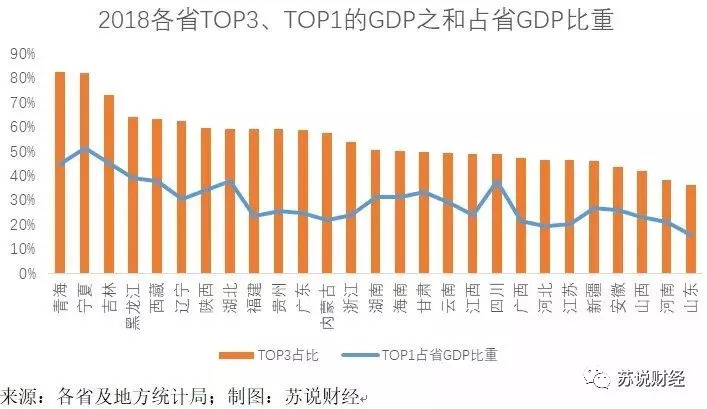 我们整理了各省市的前3名城市名单,计算其GDP之和与全省GDP的比例,以及NO.1城市GDP占全省GDP比重。