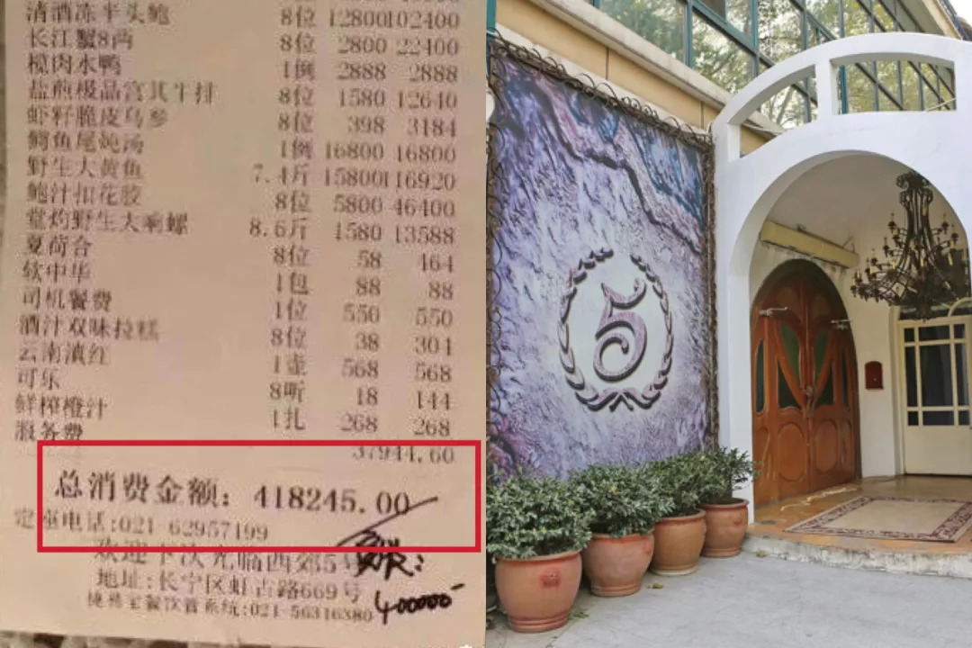 9月18日晚上,微博用户Snake_Kan发文称,“人均五万的晚饭(不是炫富)我反正是第一回吃”,并配有鲍鱼、海螺、螃蟹等菜品图片,定位显示为上海“西郊5号”饭店。随后,博主又发了一张价值41.8万的天价账单。