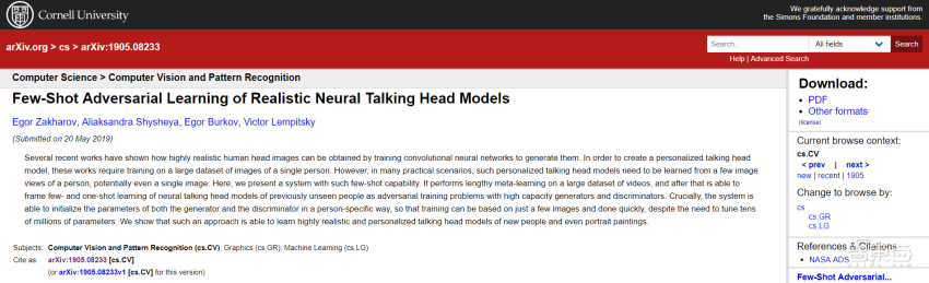 其研究论文名为《针对逼真可说话神经头像模型的Few-Shot对抗性学习(Few-Shot Adversarial Learning of Realistic Neural Talking Head Models)》 ,于2019年5月20日提交。