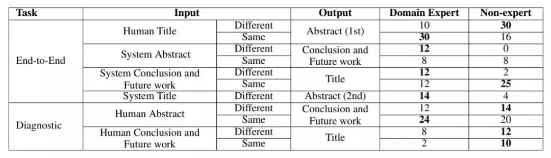 可以看到,在专家的选择中,PaperRobot生成的摘要入选率比人类撰写的摘要入选率最多高出30%,“结论和未来工作”部分最多高24%,新标题最多高出12%。领域内专家的表现并未明显优于非专家,因为这两类人倾向于关注不同方面:专家侧重于内容(实体,主题等),而非专家侧重于语言。