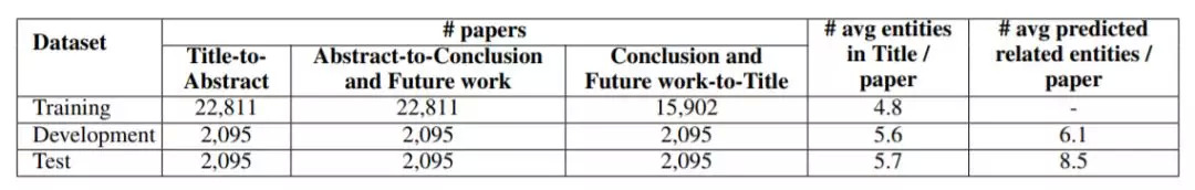 我们从PMC开放存取子集中收集了生物医学论文。为人类书面论文引用一篇论文来构建新标题预测的ground truth,我们假设论文A的标题是从论文B的“结论和未来工作”中生成的。我们从1,687,060篇论文中构建了背景知识图,其中包括30,483个实体和875,698个关系。表2所示为详细数据统计。
