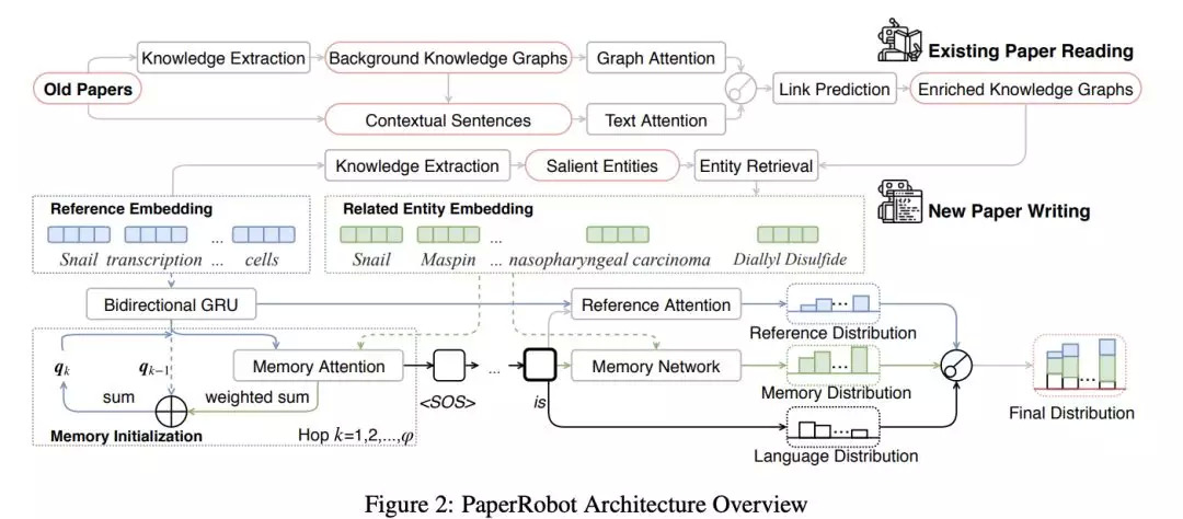 使用一个新颖的memory-attention网络架构,基于输入的标题和预测的相关实体,PaperRobot自动写出了一篇新论文的摘要,然后进一步写出了结论部分和相关工作部分,最后,为后续论文写了新标题。