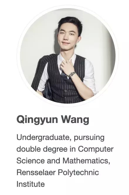 论文一作Qingyun Wang (王清昀)是伦斯勒理工学院的大四本科生,主修计算机科学与数学双学位。今年8月开始他将在伊利诺伊大学厄巴纳香槟分校读博,主修计算机科学。