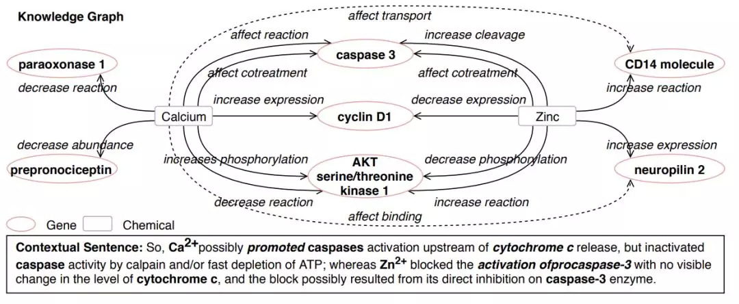 如上面的图3所示,虚线表示了预测的链接,由于钙和锌在上下文文本信息和图结构上都相似,我们预测了钙的两个新邻居:CD14分子和神经纤毛蛋白2(neuropilin 2),它们是初始背景知识图中锌的邻居。