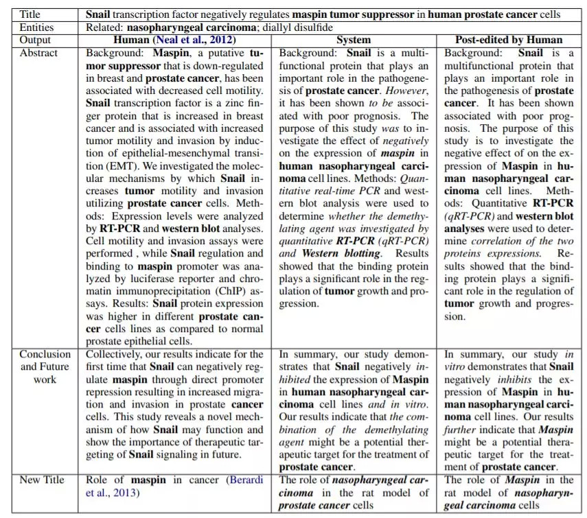 表1:人类写的论文与AI系统写的论文的比较(粗体字表示与主题相关的实体;斜体表示人工编辑)
