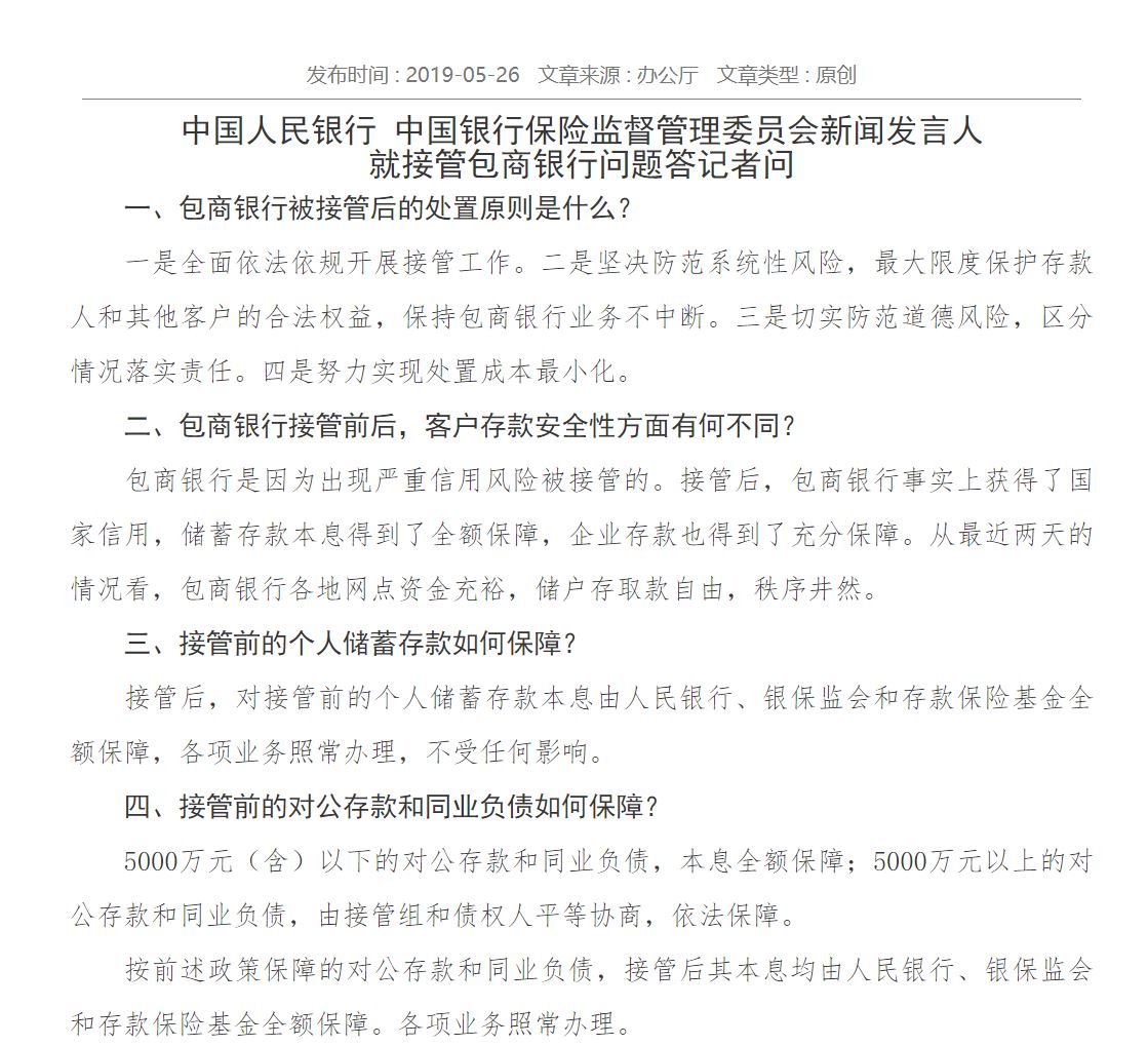 随后央行和银保监会答记者问时表示,将包商银行托管给建设银行目的在于保障包商银行正常经营,各项业务不受影响。人民银行、银保监会和存款保险基金对个人储蓄存款本息全额保障,个人存取自由,没有任何变化。