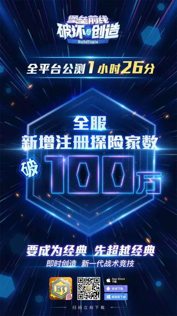 5月24日,《堡垒前线》全平台公测,同步上线桌面互通版,开测1小时全服新增注册玩家便突破100万。