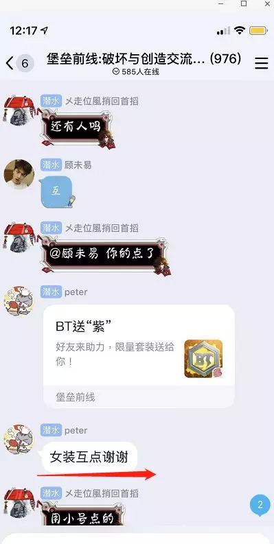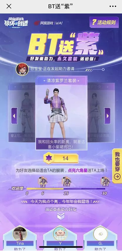 在吸引了第一批核心用户之后,官方又陆续推出各种运营活动,引导游戏声量持续发酵。在全平台公测当天开启的【BT送“紫”】活动,玩家可以通过好友助力,在游戏中免费获得史诗品质紫罗兰套装,但唯一不同的是,好友可以选择助力“异性装”,因此在交流群中,不少男玩家相互恶搞点亮对方的女装,并高呼一些紫装大佬把“小裙子穿起来”。