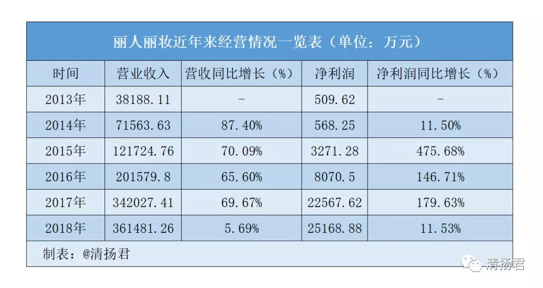 资料显示,2013—2018年,丽人丽妆营业收入分别为38188.11万元、71563.63万元、121724.76万元、201579.80万元、342027.41万元和361481.26万元,2014年—2018年营收同期增长了87.40%、70.09%、65.60%、69.67%、5.69%;