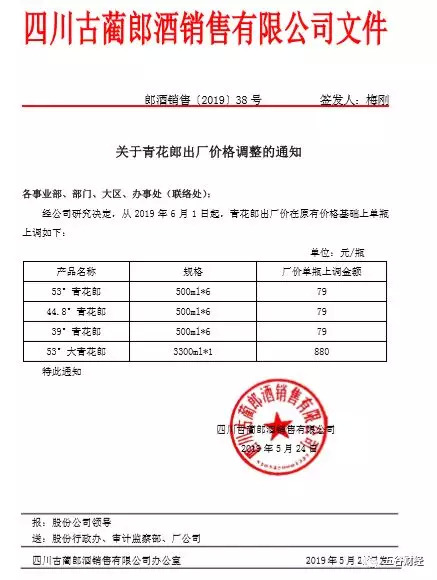 公告显示,从2019年6月1日起,青花郎出厂价在原有价格基础上单瓶上调如下:53°青花郎、44.8°青花郎、39°青花郎,三款产品(500ml*6规格)的单瓶出厂价格均上调79元;53°青花郎(规格为3300ml*1)的单瓶出厂价上调880元。