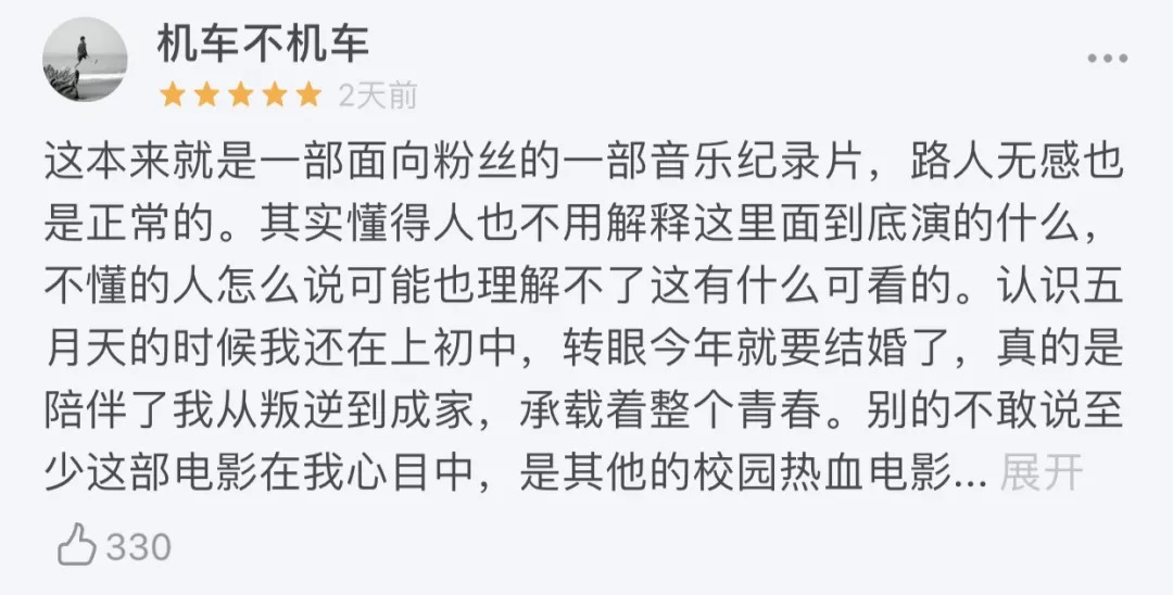 有趣的是,小荧屏上乐团大战拉开序幕,大银幕上也正在上演一代乐团“五月天”的故事,音乐纪录片《五月天人生有限公司》24日上映以来累计票房2889.9万,豆瓣8.8分,“圈钱电影”“超长MV”“演唱会录影”在一众粉丝滤镜下的评论中,仍不时会看到这些不太和谐的字眼。小众文化的乐团题材注定只能是粉丝圈层里的狂欢。