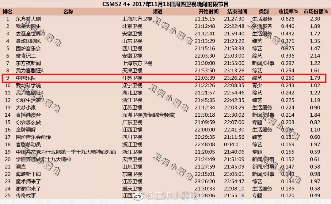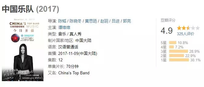 而相比乐团电影口碑与票房的不成正比,一直以来乐团综艺在口碑与收视上的双双折戟,则“协调”了很多。2017年江苏卫视播出的《中国乐队》豆瓣仅4.9分,收视上令江苏卫视险些跌出前10,甚至一度被安徽卫视、山东卫视、四川卫视、天津卫视等二三线卫视碾压。2018年CCTV音乐频道也曾推出乐团综艺《超级乐队》,而最终口碑与收视也同样不太可观。