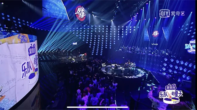 而在其他舞台设计上,过去音乐节目从舞台功能区划分,到灯光烟雾的配合,往往大繁至简,以帮助观众聚焦作品本身,如《歌手》的灯光舞美便是简约极致。而在《乐队的夏天》中,本就不规则的演播厅被划分为A、B两个舞台,还有观众区、嘉宾区、控制台散落其间,这使得节目不管是全景还是运动镜头都有些杂乱无章。而让观众眼花缭乱的除了零散不规则的功能划分,还少不了全场600多把发光吉他的“功劳”,加上灯光后整个演播厅都在发光,这令观众的注意力很容易被分散。