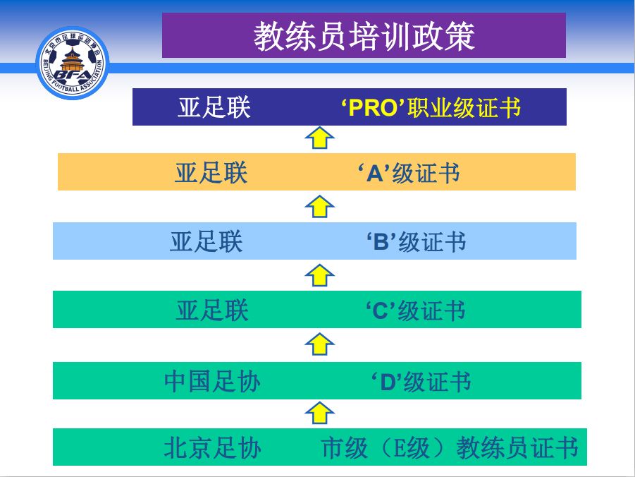 无规矩不成方圆,要想考取教练员证首先得需要知道国内教练员的等级制度,中国足协的教练员是与亚足联衔接成一体的,最低等级是中国足协D级,然后是亚足联C级、B级、A级,以及最高等级的亚足联“PRO”职业级。