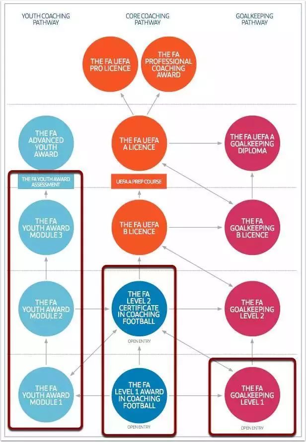 英足总旗下有很多授权的教练培训俱乐部,只需要登录英足总的官网,在Coaching Qualification 栏目下,就能够找到多达57种的教练员培训课程。点击每个课程,就会显示具体的课程内容,在你输入自己家的邮编后,就能够找到距离你最近的课程中心在哪。之后就可以看到教练课程的详细安排,如果时间合适就可以直接在网上报名。