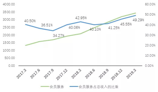 值得注意的一点是,2018年3月、2018年6月、2018年9月、2018年12月和2019年3月爱奇艺的订阅会员分别环比增长20.67%、9.46%、20.27%、8.30%和10.76%,原本每隔一个季度即增长约20%的订阅会员2019年一季度只增长了11%。