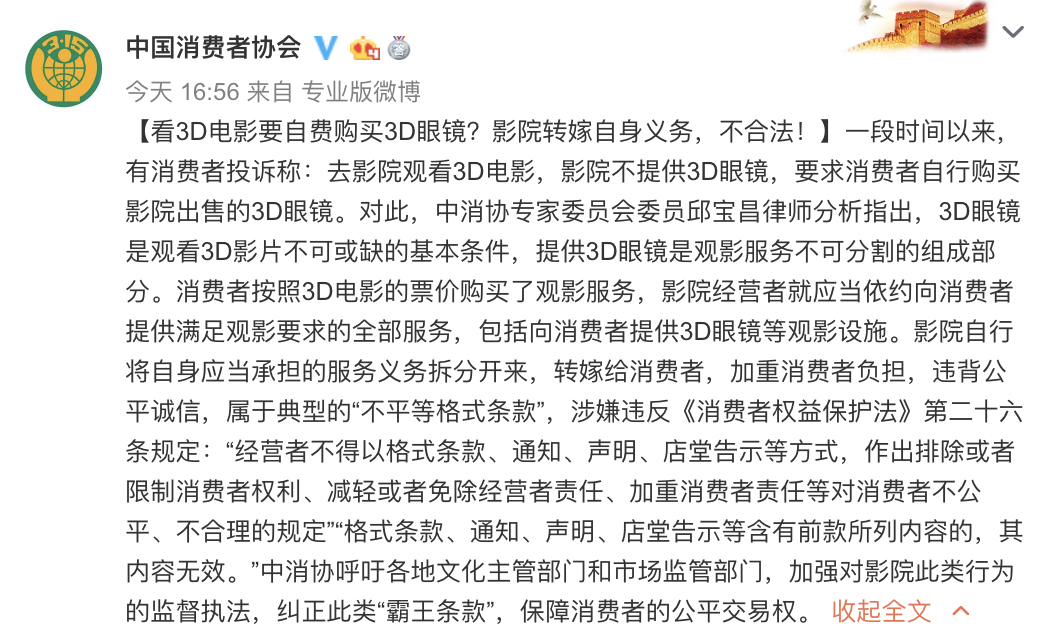 中国消费者协会官方微博27日下午就“看3D电影要自费购买3D眼镜”问题发声,认为该行为是影院自行将自身应当承担的服务义务拆分开来,转嫁给消费者,加重消费者负担,违背公平诚信,属于典型的“不平等格式条款”,涉嫌违反《消费者权益保护法》。