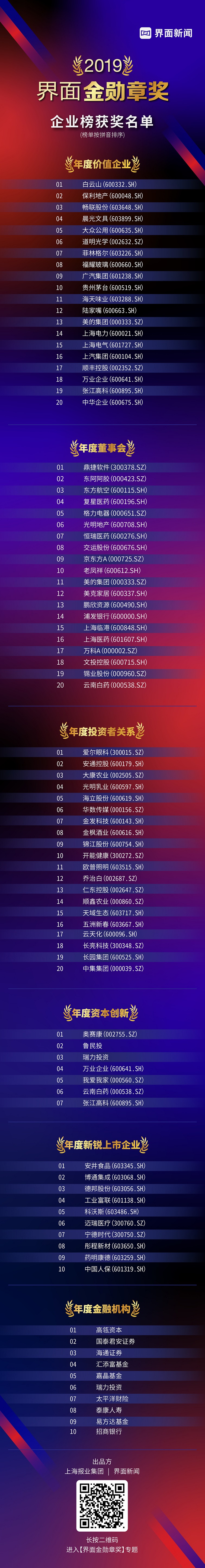 历经近5个月千锤百炼,并综合数据因子表现、全网投票排名、评委专家意见后,2019【界面金勋章奖】最终出炉资本市场8项年度大奖。20家“年度价值企业”、20家“年度董事会”获奖企业、20家“年度投资者关系”获奖企业、7家“年度资本创新”获奖企业、10家“年度新锐上市企业”、10家“年度金融机构”斩获年度企业大奖;20位“年度企业领袖”、150位“年度董事会秘书”则荣登金勋章年度人物榜。