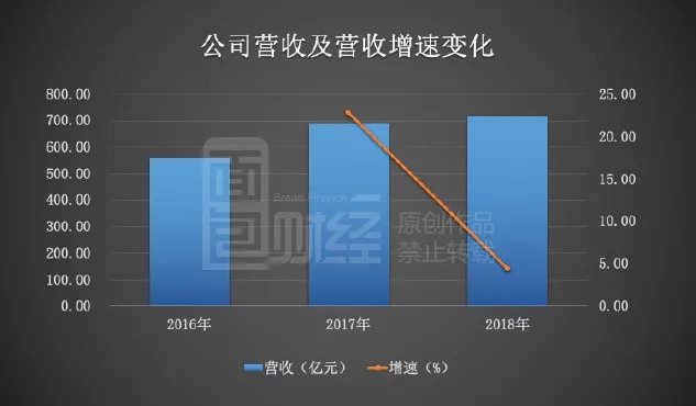 财报显示,2018年,公司营业收入718.78亿元,同比增长4.45%。营收增速相比于上一年的22.78%出现明显下滑。