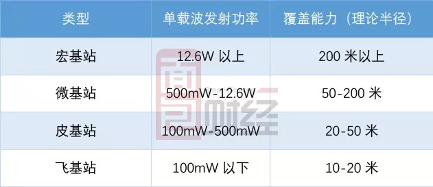 根据3GPP组织的规则,无线基站分为四类,分别是宏基站、微基站、皮基站和飞基站。其中,宏基站功率最大,覆盖范围最大;其他三类覆盖范围较小,为小基站。