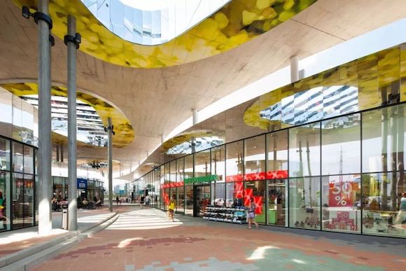 位于奥地利格拉茨的 Shopping Nord 在2015年改造扩建时,针对当地人群对餐饮、休闲娱乐空间的需求在入口处增设了高近10米的顶棚。顶棚将增设的小型商业空间与主楼相连,打破了主楼封闭的结构,同时以流线形状和鲜明的色彩增强了空间活力,顶棚下大面积的空间为市民休憩、游逛提供了宜人的环境,而顶棚两侧的商业无疑是受到了积极的带动,餐饮店外设的桌椅经常有市民聚会聊天。