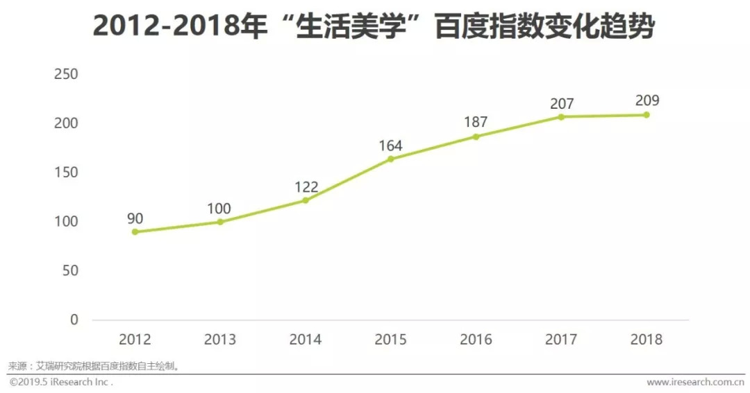 根据百度指数变化趋势,“生活美学”能代表消费者“审美意识”觉醒的关键词指数呈上升趋势,其中,“2012年,生活美学”年度平均搜索指数仅为90,2018年提升至209。