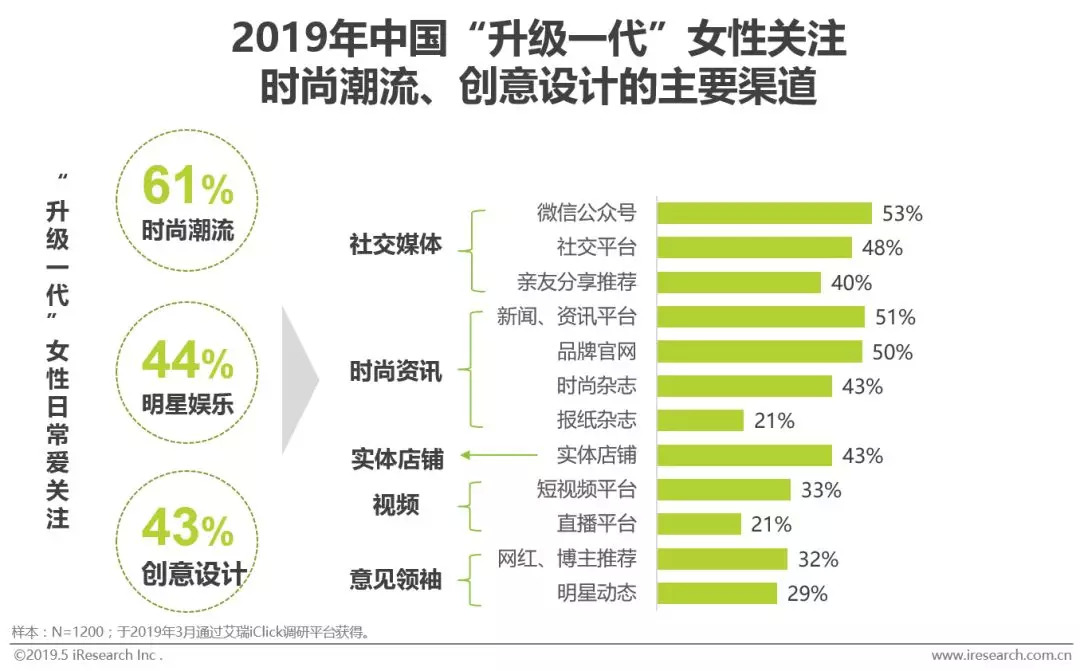 61%“升级一代”女性在日常生活中会主动关注时尚潮流,44%会关注明星娱乐动态,并留意创意设计。