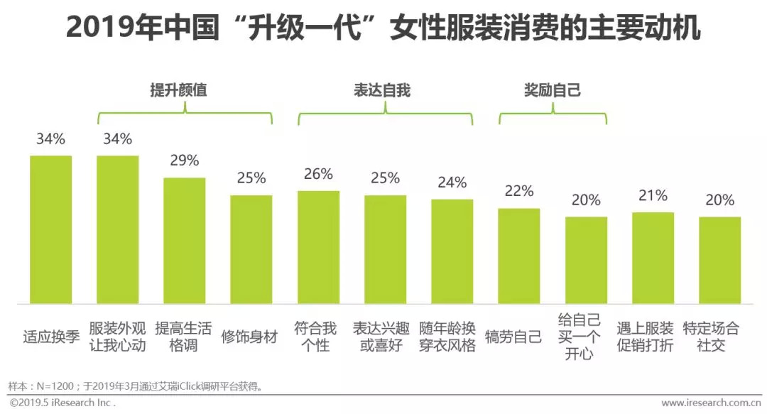 除“适应换季”(占比34%)这一刚需外,“服装外观”的颜值打动占比34%,其次是“提升生活格调”与“修饰身材”,分别占比29%、25%;“升级一代”女性也偏好用服装表达自我,其中,服装款式“符合我个性”占比26%,“表达兴趣或爱好”占比25%。