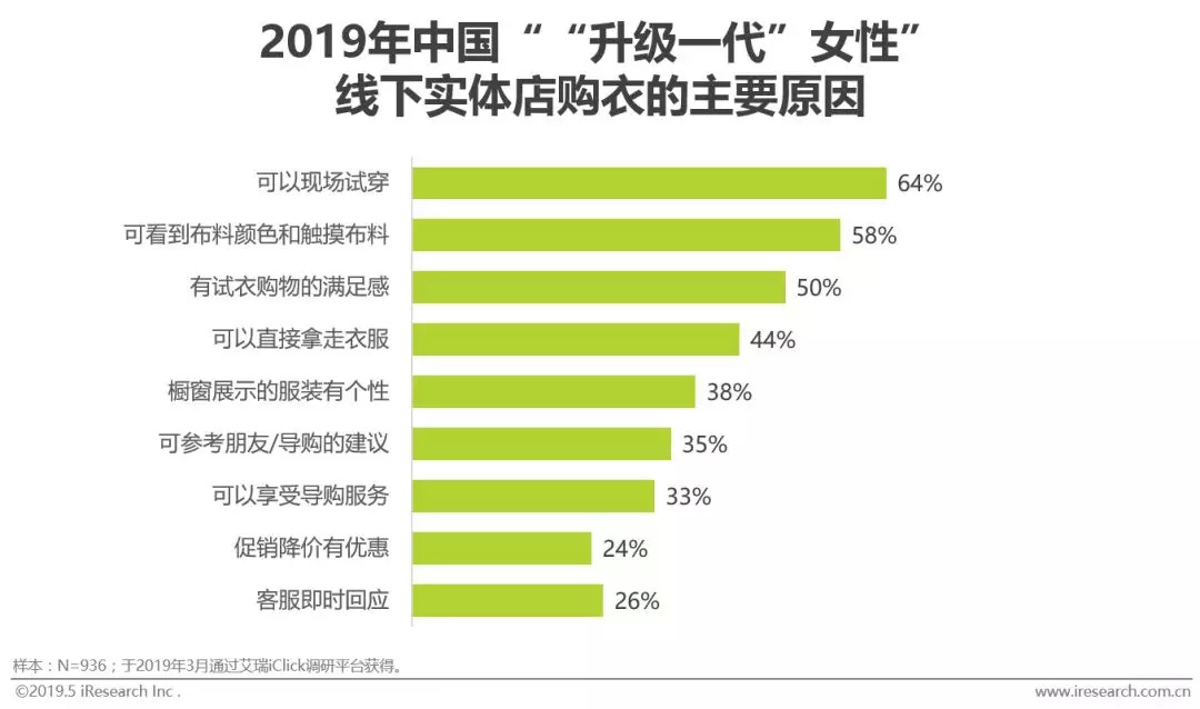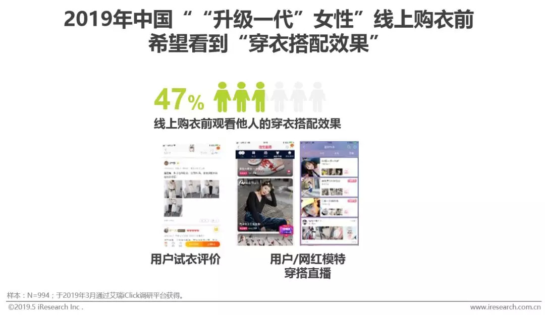 “升级一代”女性消费者选择在线下实体店购买衣物主要原因在于“现场试穿”和“现场感受和触摸”等即时的体验感。这种对“即时感”的追求也延伸到线上购衣的过程中,在购买前观看他人的穿搭效果,进而选择观看网红模特的穿搭直播等都成了满足“即时感”的有效方式。