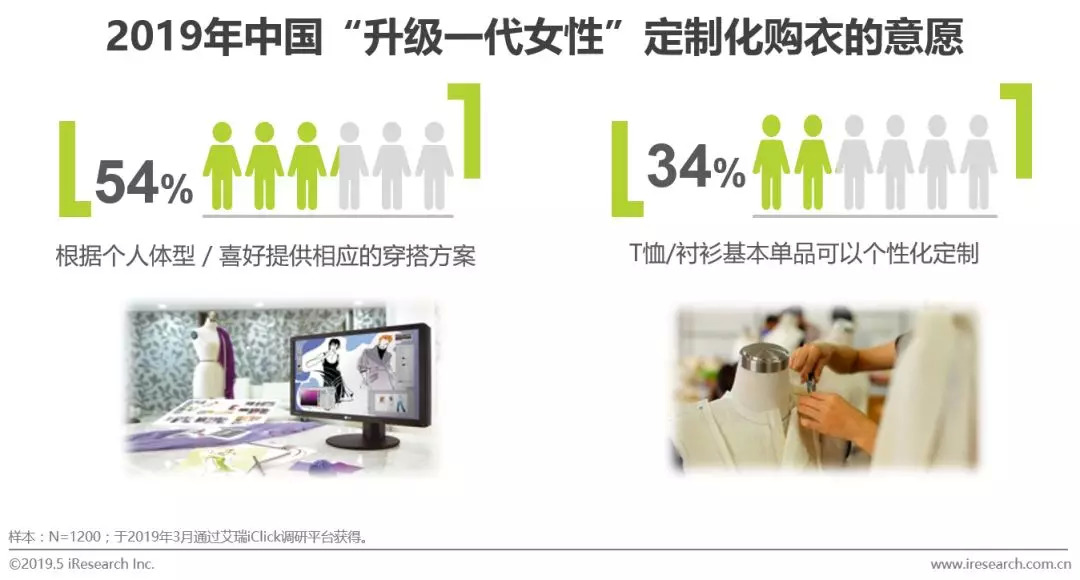 54%“升级一代”女性希望能够根据“根据个人体型/喜好提供相应的穿搭方案”,34%“升级一代”女性想个性化定制“T恤/衬衫基本单品。
