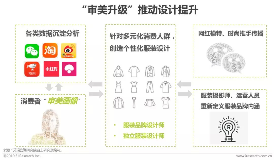 在服装行业,“升级一代”消费者审美升级,驱动服装生产商与各电商平台,分析各类消费与社交数据所得出的消费者审美偏好,针对多元化的人群创造更多个性化服装设计。