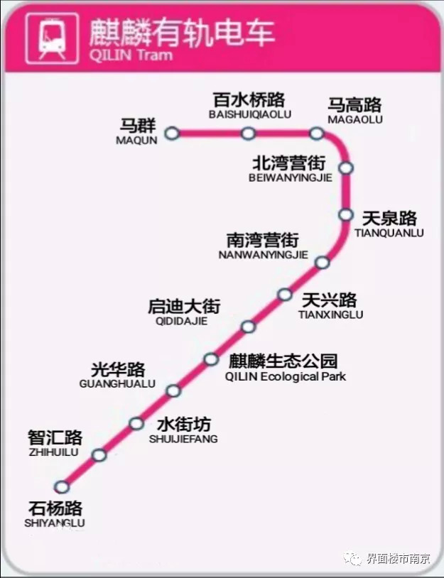 有轨电车向北可到地铁2号线马群站,与地铁形成无缝对接;往南与10号线东延石杨路站换乘,可顺达河西、江北等地,可以说去南京各区块都还算便捷。
