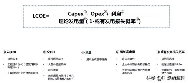 上图为LCOE的主要组成及细分解读,共分为建设成本(Capex)、运维成本(Opex)、理论发电量、或有发电损失概率和利息五个部分。除利息部分外其余四部分的变量均与设备厂家直接相关,开发商需通过合理的招标规则设置把控公式中的相关变量,具体方式建议如下: