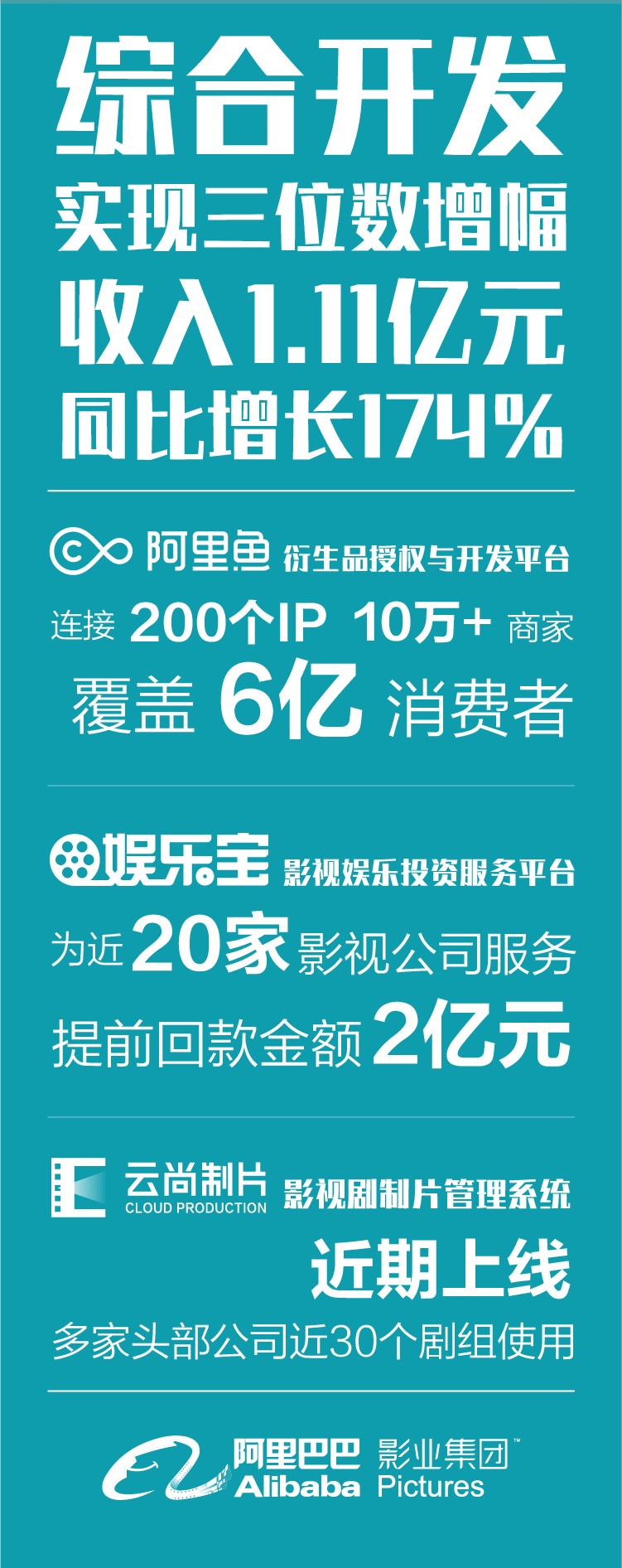 以衍生品授权开发和影视娱乐投资服务为核心的综合开发业务,是阿里影业的重要战略版块之一。在报告期内,综合开发业务获得收入1.11亿元,相对于过往同期增长174%,营业收入首次实现三位数增幅。