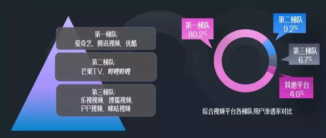 针对这样的声音,今年的《2019中国网络视听发展研究报告》一锤定音,从行业层面对于目前视频网站的竞争格局进行了界定,提出目前爱奇艺、腾讯视频和优酷稳居第一梯队,2018年台收看过网络视频节目的用户占整体网络视频用户的89.6%,三大平台整体用户渗透率为80.2%