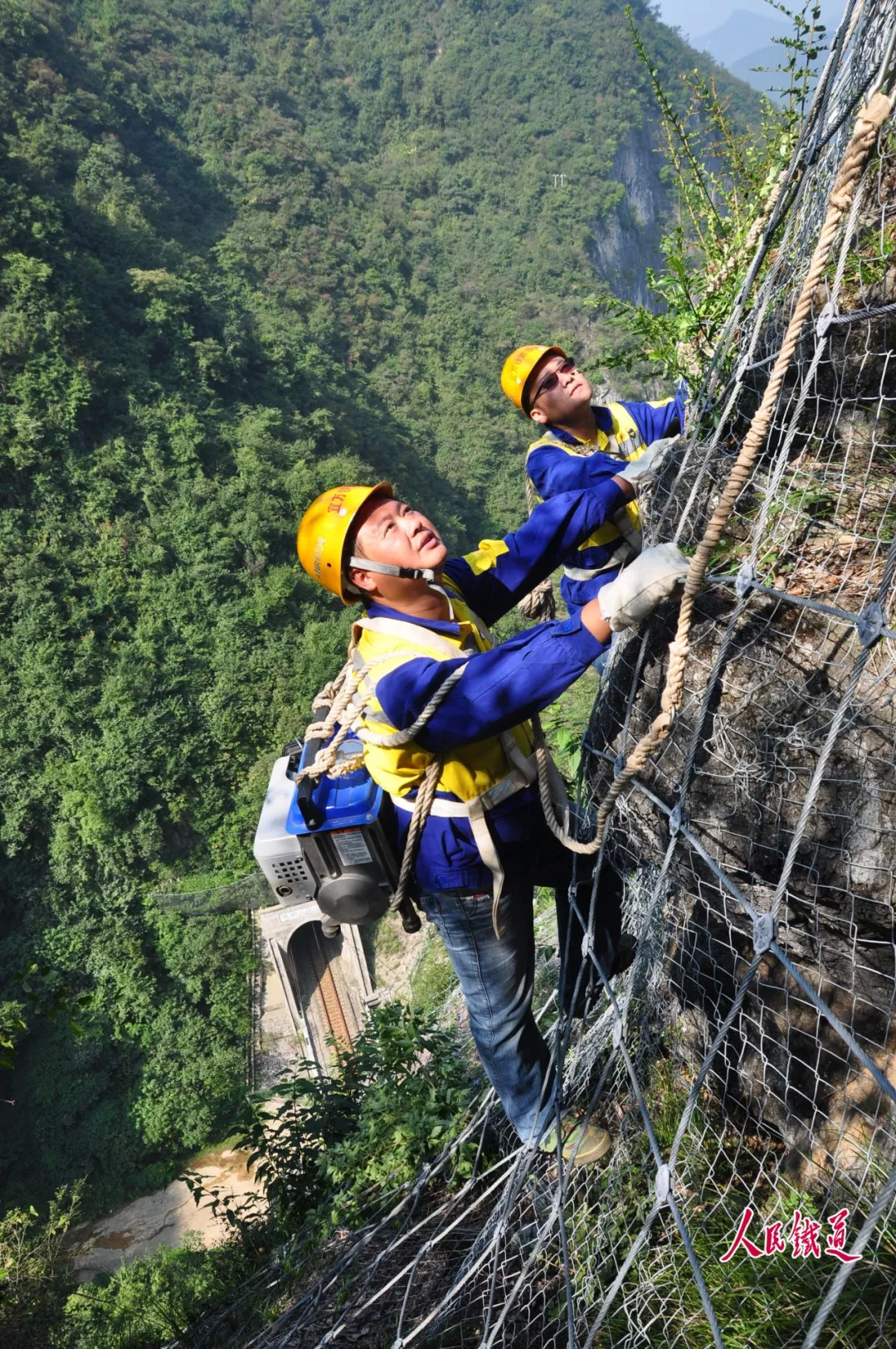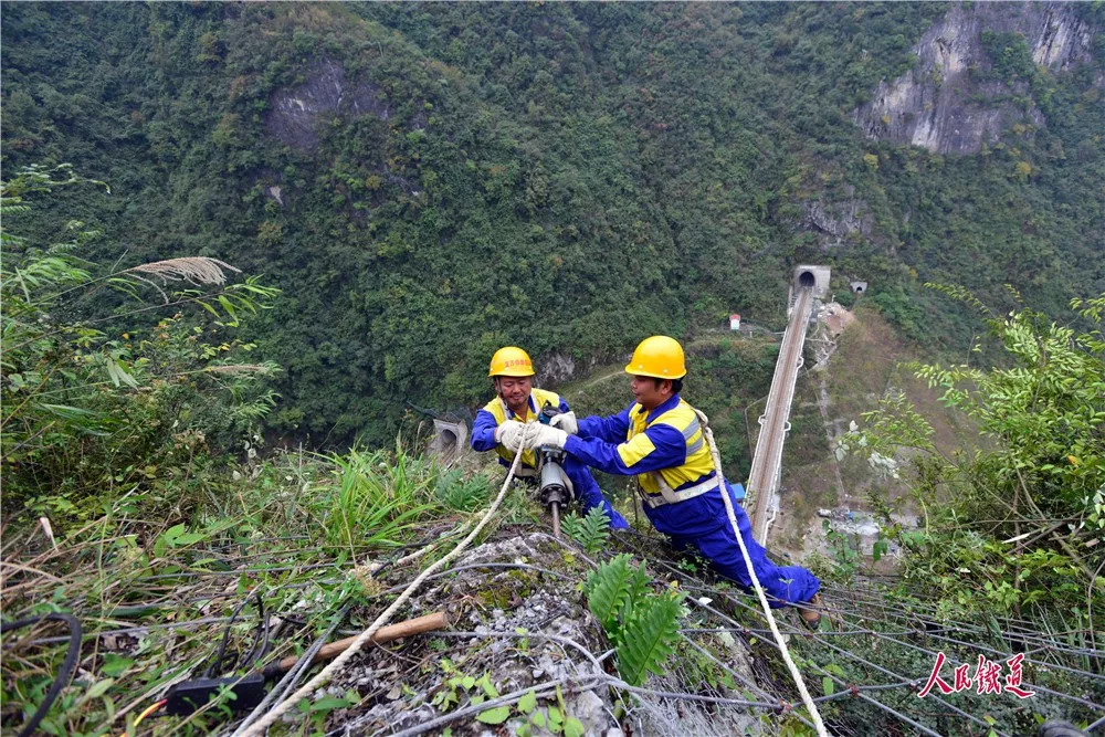 鲁朝忠和工友们像蜘蛛侠一般依附于山体上,缓慢移动,身下就是万丈深渊,还有如玉带般蜿蜒穿行于武陵大山中的宜万铁路。