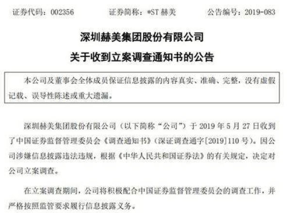 5月27日深圳赫美集团发布公告表示,就此已经收到证监会立案通知书。