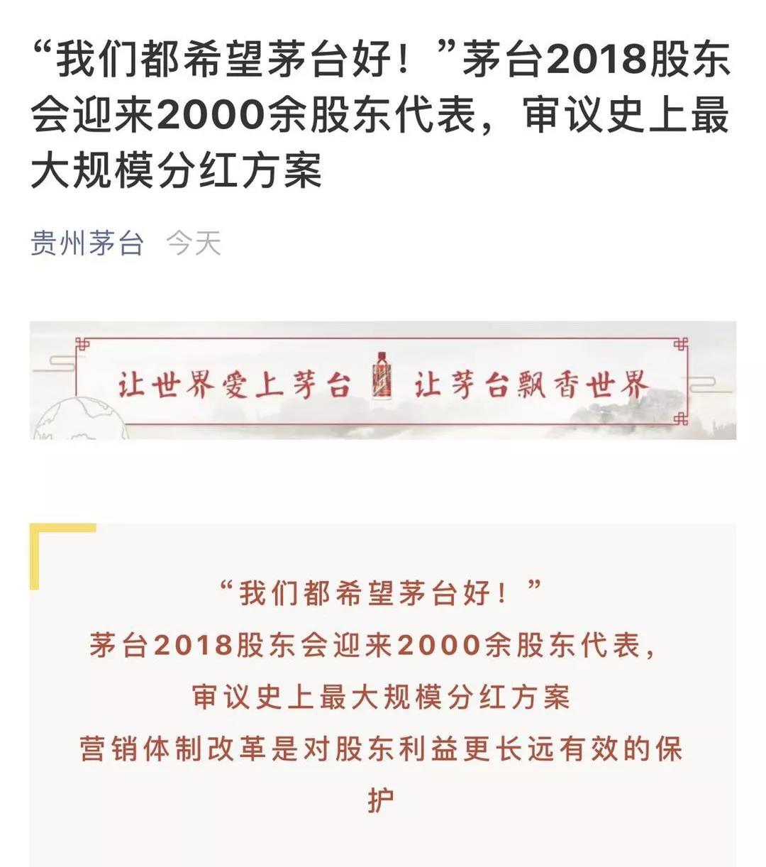 “贵州茅台去年取得了不错的业绩,有了一份漂亮的报表。这次提交会议的分红方案,应该说已经尽了最大的诚意,而且又一次创下了茅台上市以来的新高。”
