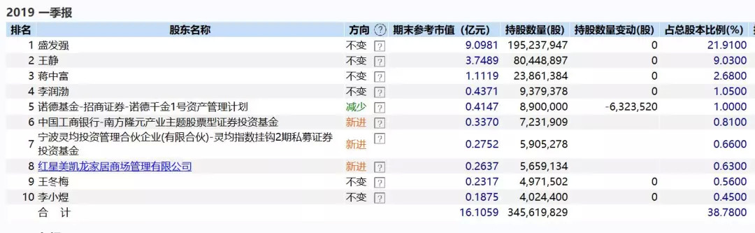 公司今年一季报数据显示,盛发强持股比例为21.91%,持股市值为7.7亿元,王静目前持股比例为9.03%,持股市值为3亿元。