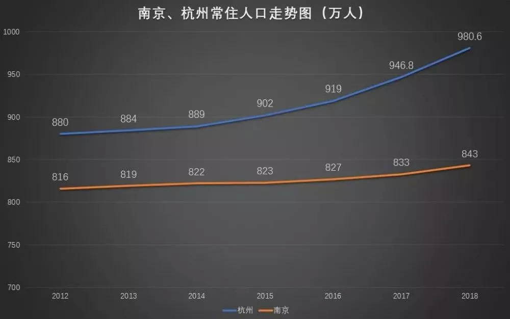 一直以来与南京相抗争的杭州人口增长的态势却十分迅猛。2018年末,杭州常住人口达到980.6万人,2017年为946.8万,常住人口净增33.8万,前年增加了28万。今年,杭州也将正式迈入千万人口时代。现杭州落户门槛再度放松,未来宁杭之争也会更加激烈。