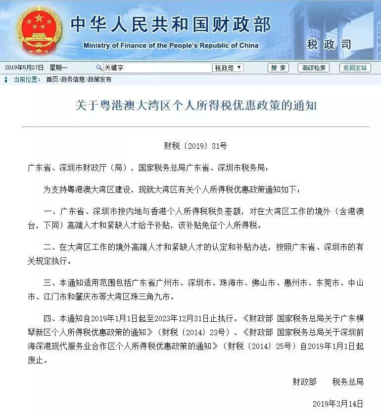粤港澳大湾区将对短缺人才实行个税优惠,最早出现在今年3月14日国家财政部、税务总局发布的《关于粤港澳大湾区个人所得税优惠政策的通知》中。